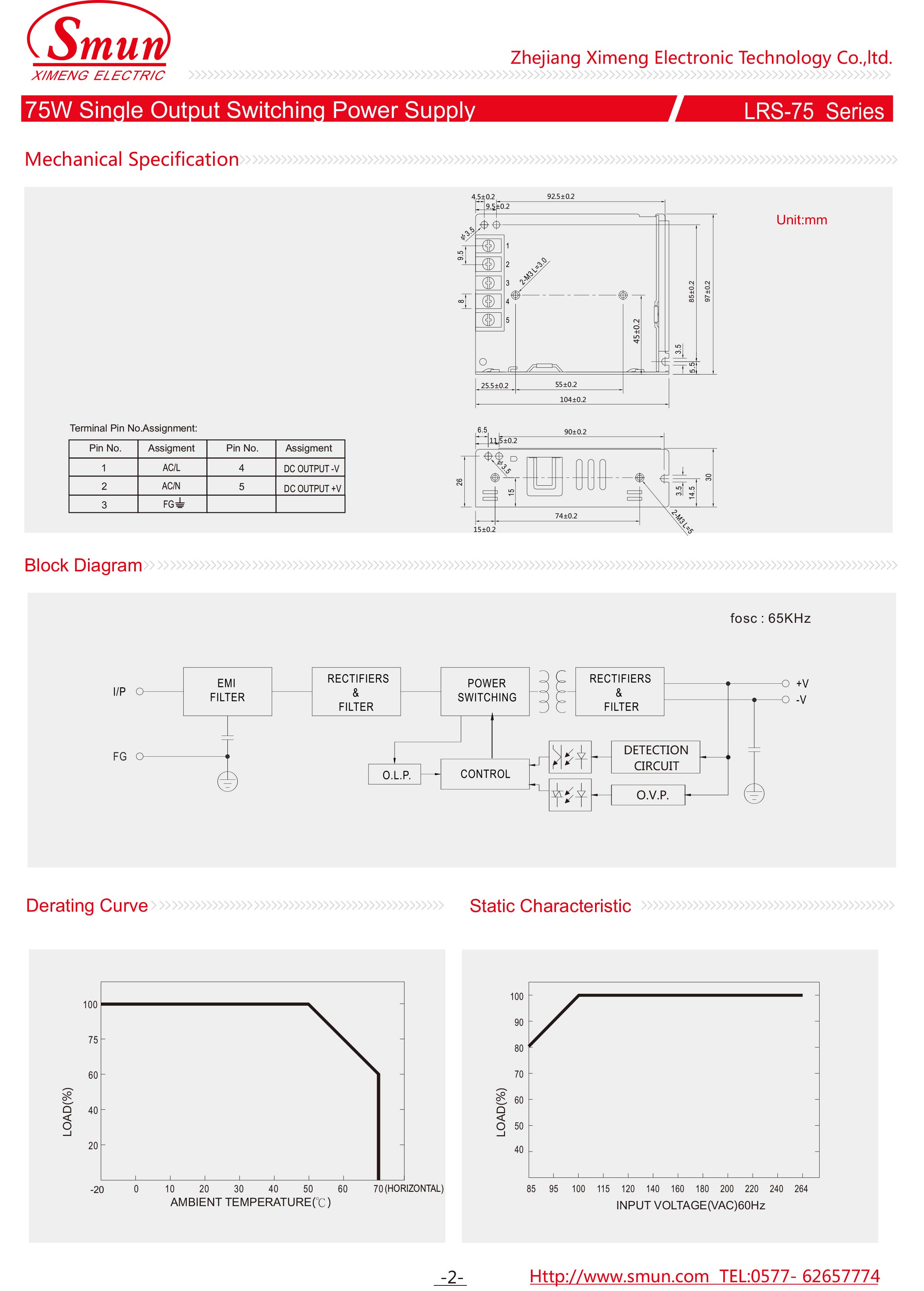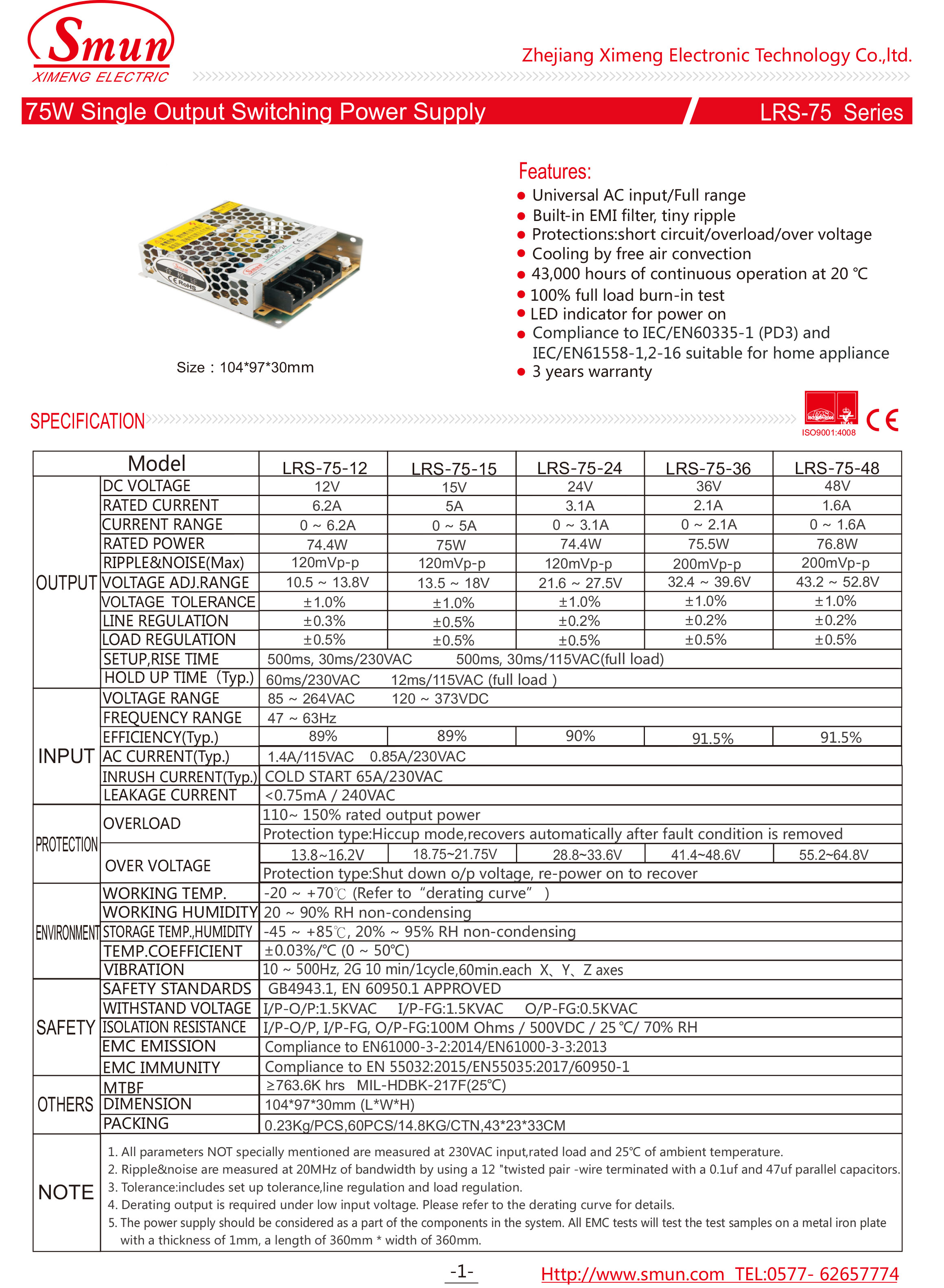 La serie LRS-75 è un alimentatore di tipo chiuso a uscita singola da 75 W con 30 mm di design a basso profilo. Adottando l'ingresso 85-264 V CA a gamma completa, l'intera serie fornisce una linea di tensione di uscita di 5 V, 12 V, 15 V, 24 V, 36 V e 48 V .