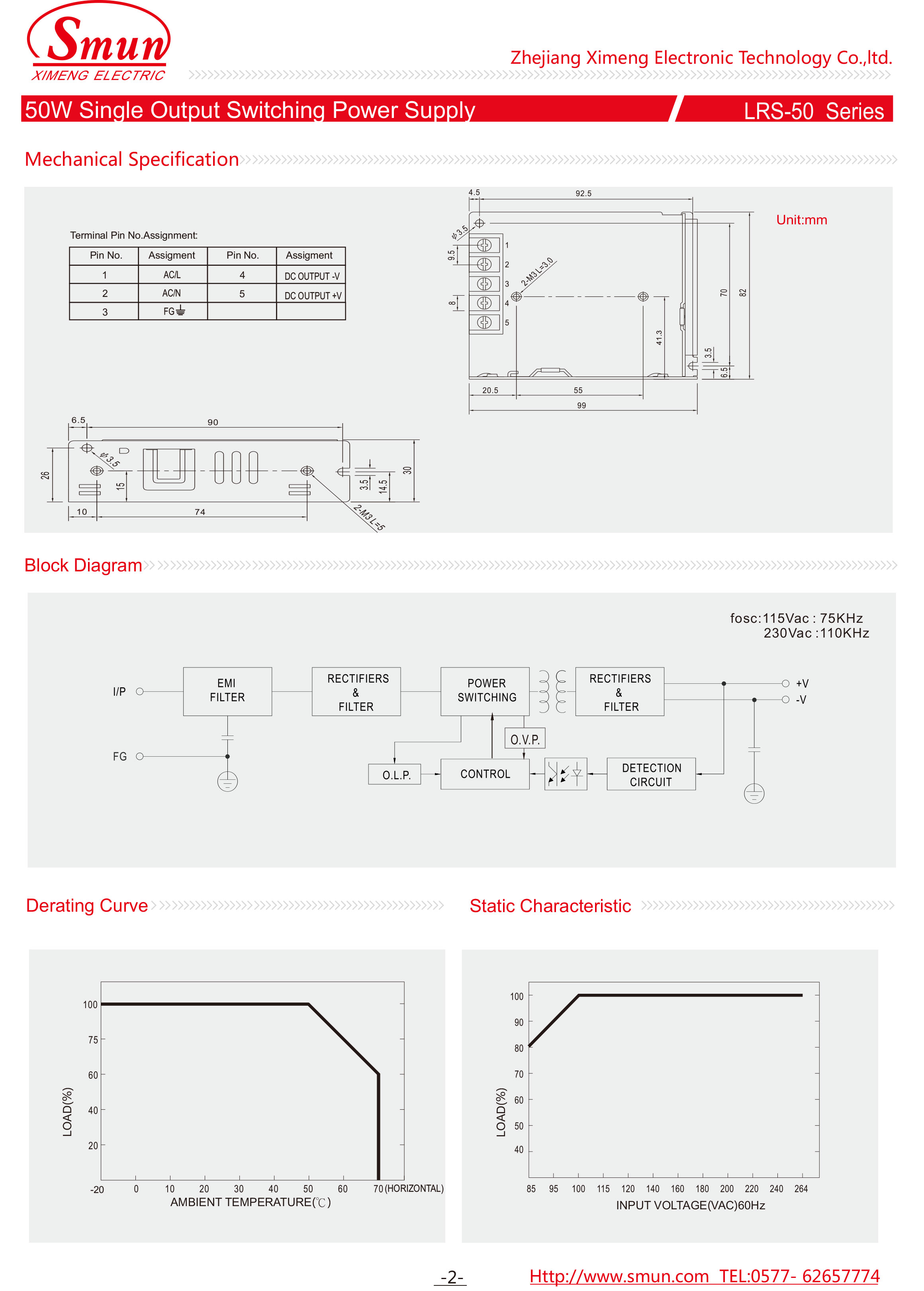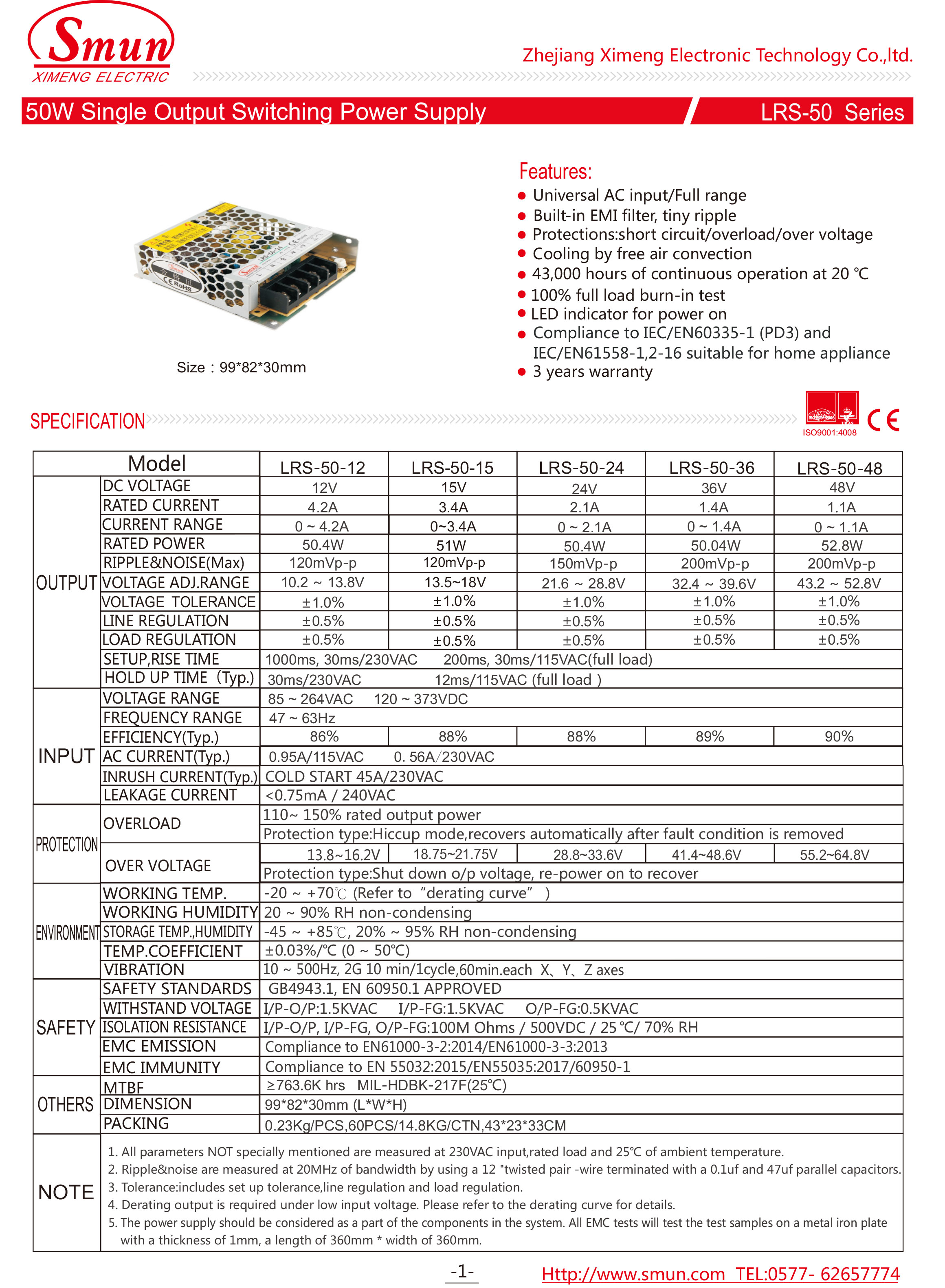 La serie LRS-50 è un alimentatore di tipo chiuso a uscita singola da 50 W con 30 mm di design a basso profilo. Adottando l'ingresso 85-264 V CA a gamma completa, l'intera serie fornisce una linea di tensione di uscita di 5 V, 12 V, 15 V, 24 V, 36 V e 48 V .